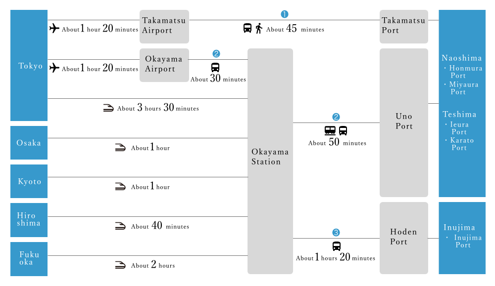 The easiest way to get to Benesse Art Site Naoshima is from either Takamatsu Port or Uno Port. For guests who are going directly to Inujima, taking passenger boat from Hoden port is the most convenient.