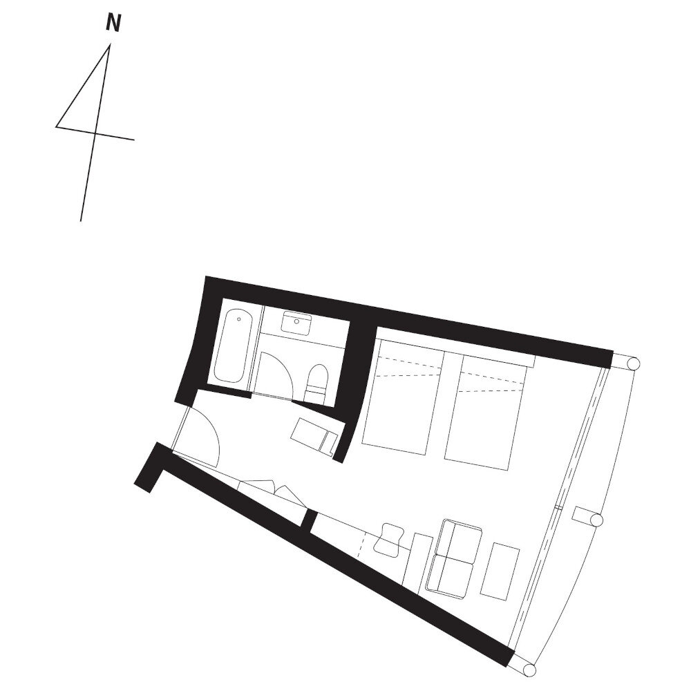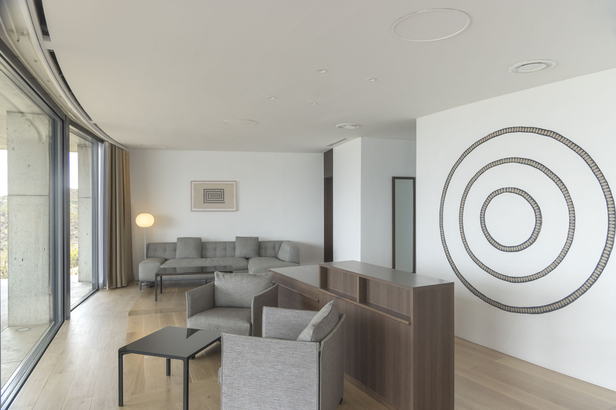 ベネッセハウス4棟の中で、最も高い場所にある客室です。客室に備わる大きな開口部からは、眼下に広がる瀬戸内の自然を室内に居ながら感じられる設計になっています。