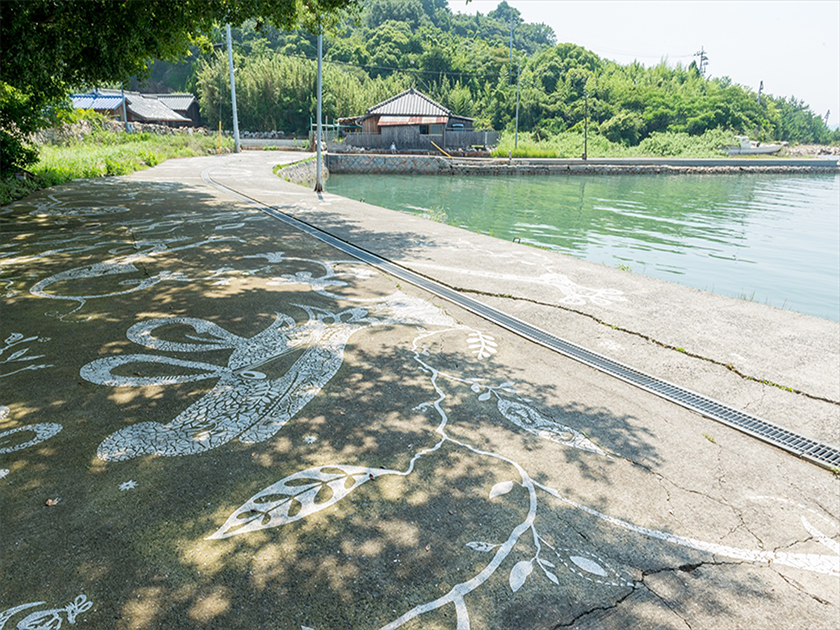 《太古の声を聴くように、昨日の声を聴く》は、かつて花崗岩の産地として採石業で隆盛を極めた犬島の集落内で、当時すでに空き地となっていた石職人の家の跡地に制作されました。舗装道路の白線に使用される溶着性の白いゴム素材を、ガスバーナーで地面に焼き付ける手法で、様々な動植物や船などが描かれています。2013年に行われた第2回瀬戸内国際芸術祭で初めて公開されました。